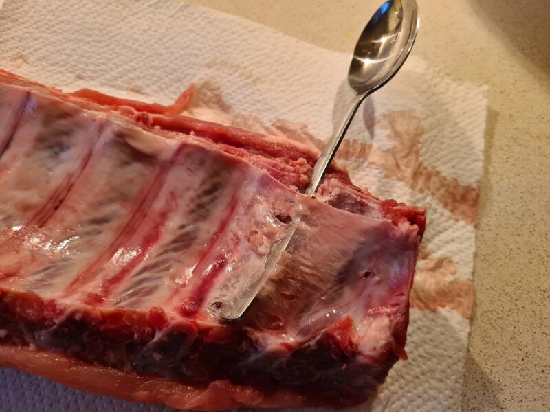 Er zijn verschillende technieken om het vlies te verwijderen. Het kan met een mes, een schroevendraaier, een lepel of gewoon met keukenpapier. Zelf gebruik ik op de foto de achterkant van een lepel, maar soms gebruik ik ook een mes. Keukenpapier is handig voor extra grip bij het verwijderen van het vlies. Onderstaand 2 YouTube video's van Noskos BBQ en BBQ Junkie waarin uitgelegd wordt hoe je het vlies eenvoudig verwijderd.
