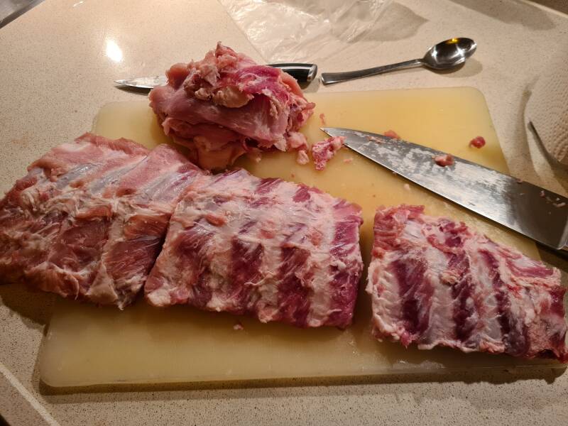 Controleer je spareribs goed voordat je begint met voorgaren. Vooral bij de boven en onderzijde van de botjes kunnen wat splinters zitten van het zagen. Ik verwijder alle losse stukjes bot met een mes, of soms zelfs met een schaar. Halve botjes aan het uiteinde verwijder ik ook. Je spareribs zijn nu klaar voor het voorgaren.