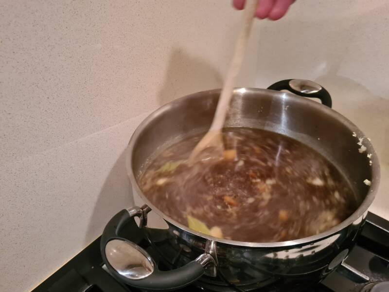 - Voeg alle ingrediënten toe aan het water en breng de bouillon aan de kook