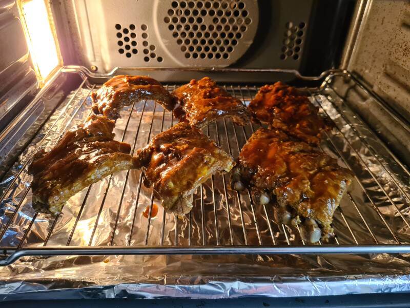 Experimenteer wat met de tijd. Als je de tijd hebt kun je het ook 8 uur in de oven laten staan zonder het daarna te koken. Controleer de spareribs in de pan regelmatig. Zie je dat de botjes loszitten? Dan zijn de gaar en kun je verder naar het afgrillen.