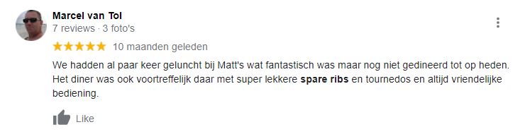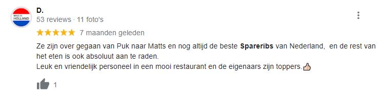 Ik geef de spareribs als cijfer een 7,5. De spareribs hebben veel potentie en een hoger cijfer geef ik graag als de marinade nét even wat lekkerder is en het portie een tikkeltje groter. Laat vooral weten wat jij vind van de lekkere ribbetjes van Brasserie Matt's!
