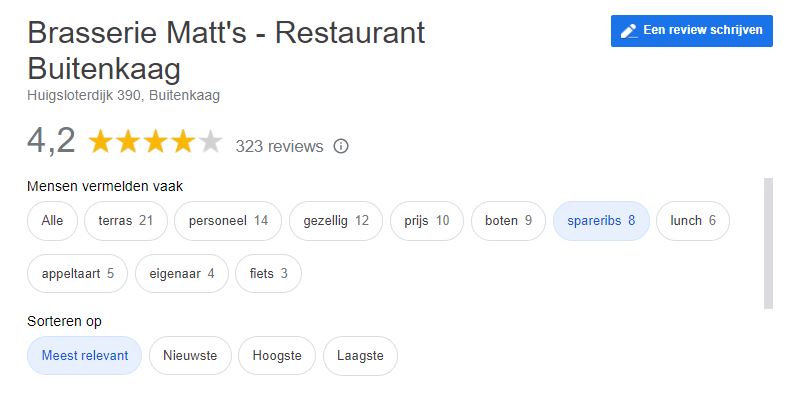 Vanavond heb ik een afspraak in Roelofarendsveen, dus snel maar eens gekeken of ik ergens in de buurt goede spareribs kan halen. Vorige week ben ik Bij René, ook bekend als het Wapen van Leimuiden, geweest, en dat waren bijzonder lekkere spareribs! Meestal zoek ik naar restaurants met goede recensies, want mijn ervaring is dat de spareribs over het algemeen goed zijn als veel klanten de moeite nemen om een review bij Google achter te laten. Door bij Roelofarendsveen een stukje A4 te pakken kom je al snel bij de A44 en zodoende mijn zoekgebied al snel verlegd naar deze snelweg die je via de Duin- en Bollenstreek al snel weer naar Leiden brengt. Mijn oog viel op Brasserie Matt's in Buitenkaag. Brasserie Matt's krijgt (op het moment van schrijven) een 4,2 als beoordeling op Google met maar liefst 323 reviews. Slechts 8 beoordelingen gaan over de spareribs, maar alle 8 zijn bijzonder positief. Zo schrijft Marcel dat Brasserie Matt's 'super lekkere spare ribs' serveert en Gilia heeft 'van het weekend spareribs besteld voor bijna iedereen op de Keverhaven, wat heeft iedereen genoten'. D. gaat nog een stapje verder en vind de spareribs van Matt's 'nog altijd de beste spareribs van Nederland', net als Jean-Pierre die ze 'de beste spare-ribs van de omstreken' noemt. Dat klinkt veelbelovend!