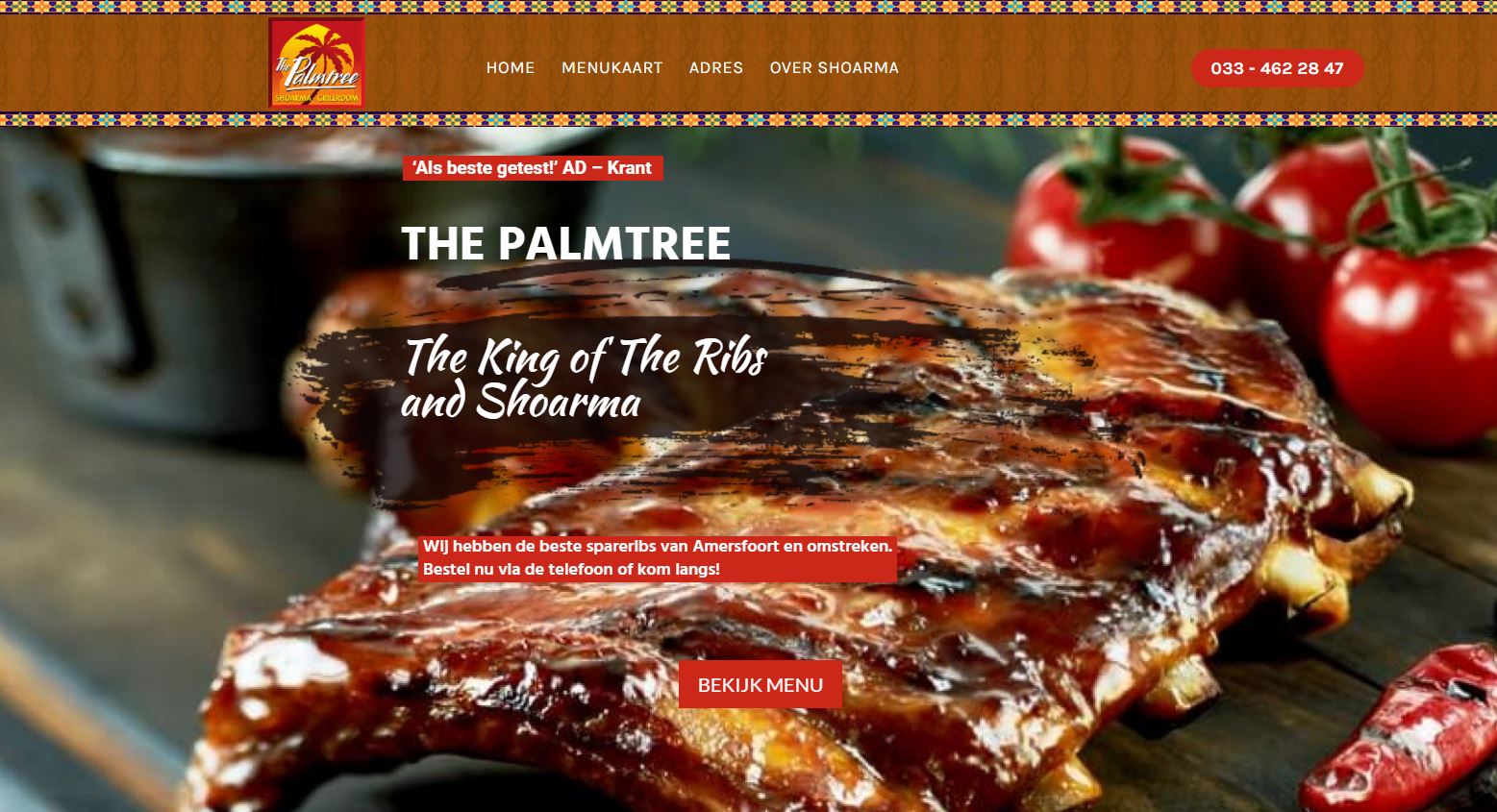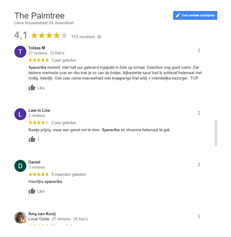 Het is nu mijn zomervakantie en deze breng ik door op een camping in Gelderland. Het is wat moeilijker om hier in de buurt goede spareribs te vinden. Ik heb helaas hier in de regio nog geen Topribs Award of Ribmeister Award uit kunnen reiken. Besloten om toch maar iets kritischer te zijn bij het selecteren van restaurants voor spareribs. Zelf verblijf ik op de Veluwe, en Amersfoort is als grote stad met ca. 30 minuten rijden relatief dichtbij. Dus maar even via Google gezocht naar restaurants in Amersfoort die bekend staan om lekkere spareribs. Al snel komt The Palmtree naar voren. 'The King of The Ribs and Shoarma', 'Wij hebben de beste spareribs van Amersfoort en omstreken' en 'Wij serveren al meer dan 20 jaar lang en 7 dagen per week de beste Shoarma en Spare-Ribs in Amersfoort' valt te lezen op de website. Ook op Google staan vele positieve recensies over de spareribs. Dat moet goed komen!