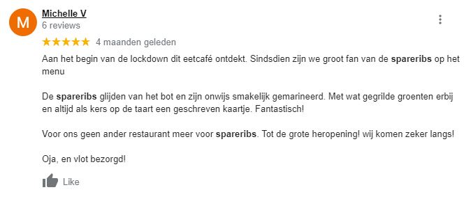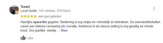 Ga respectvol om met ondernemers. Om verschillende redenen kunnen de spareribs een keer tegenvallen, of kan een personeelslid zijn of haar dag niet hebben. Onnodig kwetsende of irrelevante opmerkingen worden door ons verwijderd.