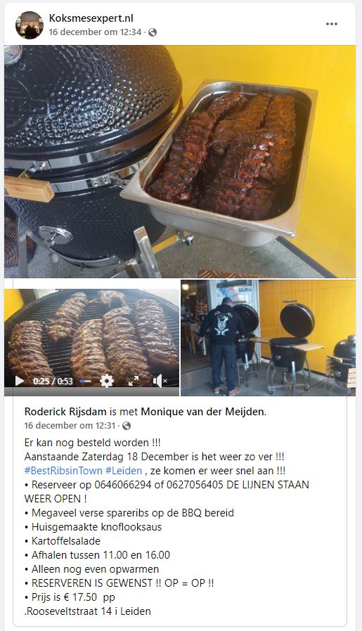 Mijn oog viel deze week op een bericht op de Facebook-pagina van Koksmesexpert.nl. Hierbij stond de hashtag #BestRibsinTown. Je begrijpt, mijn interesse is dan gelijk gewekt! De spareribs zijn via telefoon te bestellen en kunnen dan op de zaterdag, in dit geval 16 december 2021, afgehaald worden bij de messenwinkel op bedrijventerrein Roosevelt in Leiden. Ik meen dat ik een jaar of 2 terug al eens spareribs gehaald heb hier. Toen waren ze voor zover ik mij kan herinneren prima. Bestellen was overigens telefonisch zo geregeld. Eigenlijk was het al op, maar uiteindelijk kon ik vanaf de reservelijst toch nog 2 porties bemachtigen. Al met al ben ik zeer vriendelijk geholpen door Monique.